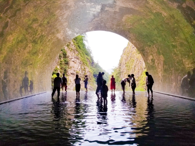 第三見晴所は、赤い色調のガラスが使われていて、周囲の自然が異なる色合いで見える仕掛けがされています。ここでは写真を撮る人が多く、光の入り方によって幻想的な一枚が撮れることも。ラストの第四見晴所「パノラマステーション」は、トンネルのハイライトとも言える存在。床に水が張られていて、山や空が映り込み、インスタ映えするスポットとして多くの観光客が訪れています。