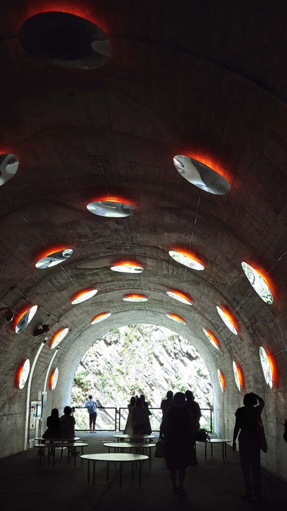 トンネル内には複数の展望スペースがあり、それぞれデザインが異なります。カラフルなライトアップや幾何学模様の空間など、歩くだけでワクワクする仕掛けがいっぱい。自然の岩肌と現代アートのコントラストが独特の世界観を作り出しています。