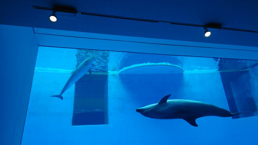 イルカのショーの後は下の階に行くとイルカのプールの下部分が見えてイルカの観察にもってこい!👇